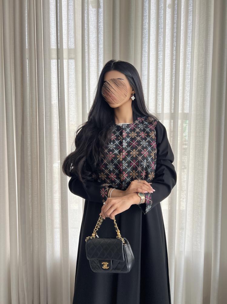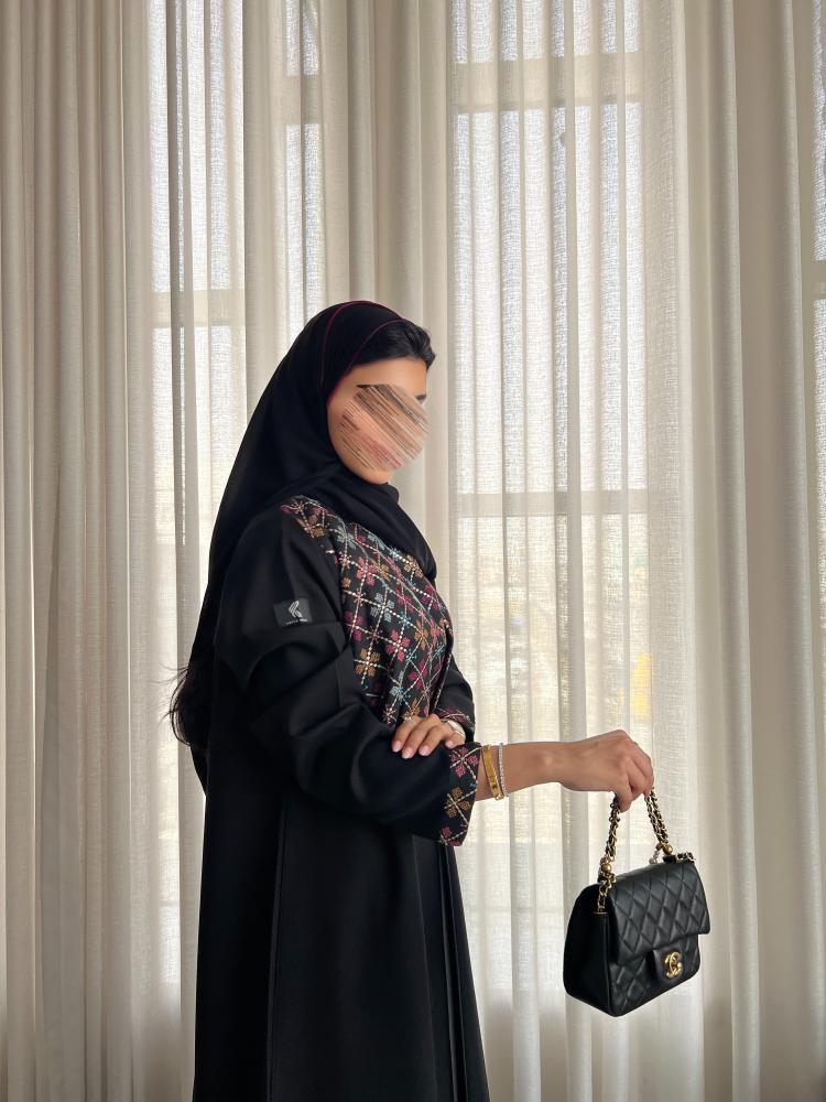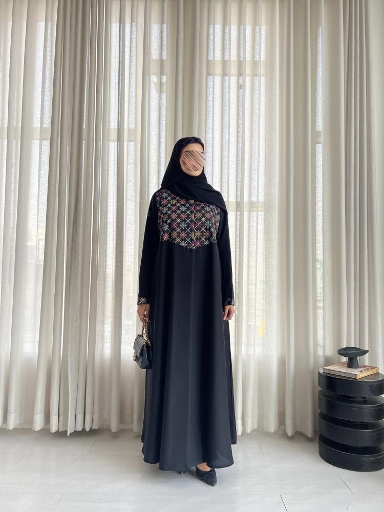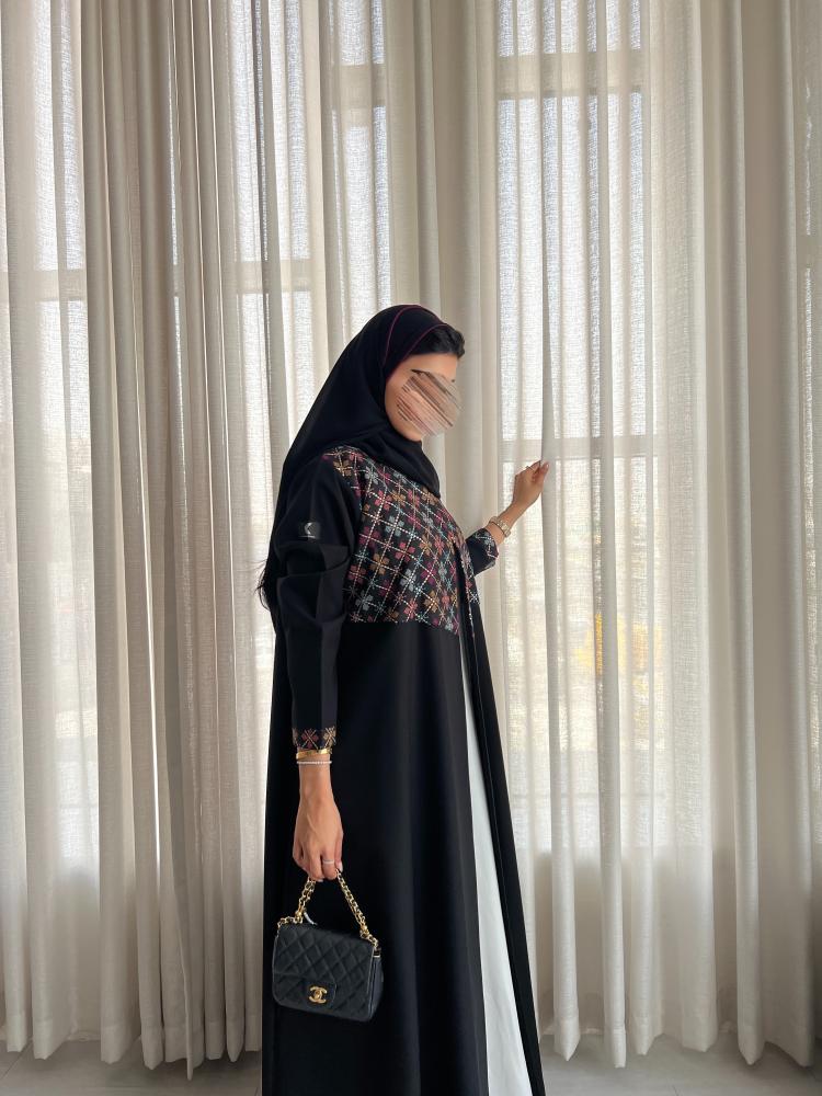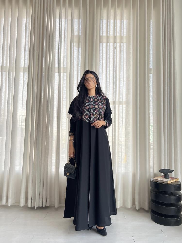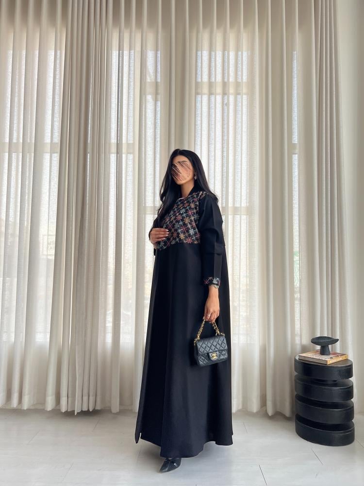 عباية كتان اسود مع تدخيلة لنن هندي مطرز