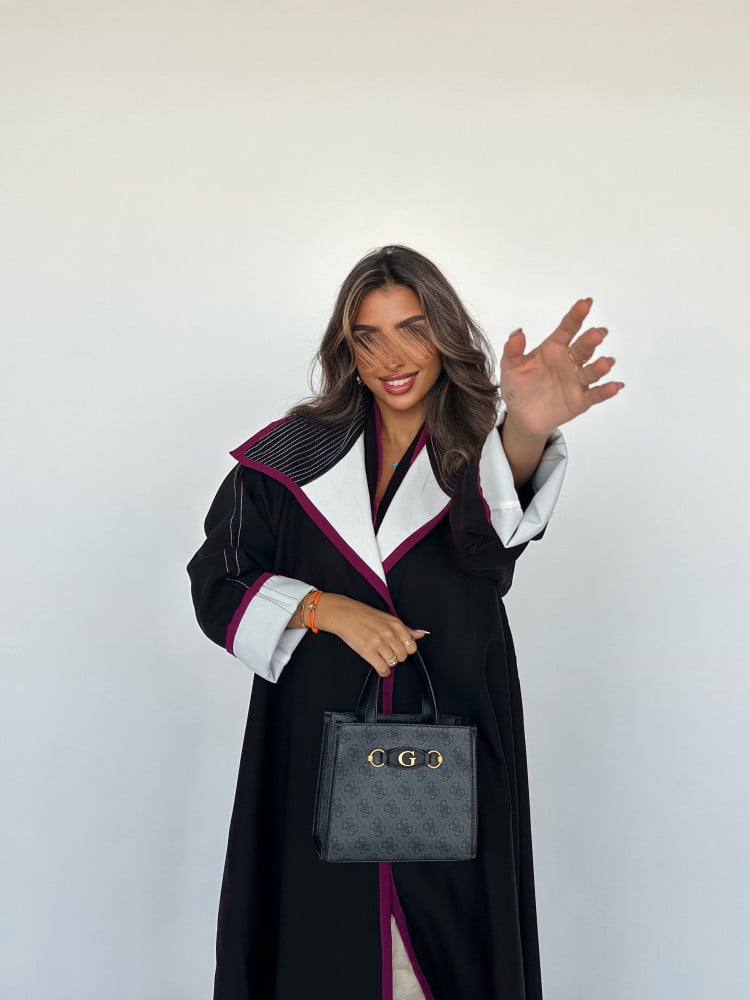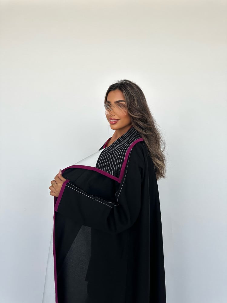 تُرفق طرحة مع العباية بلون أسود و تحديد لون توتي.