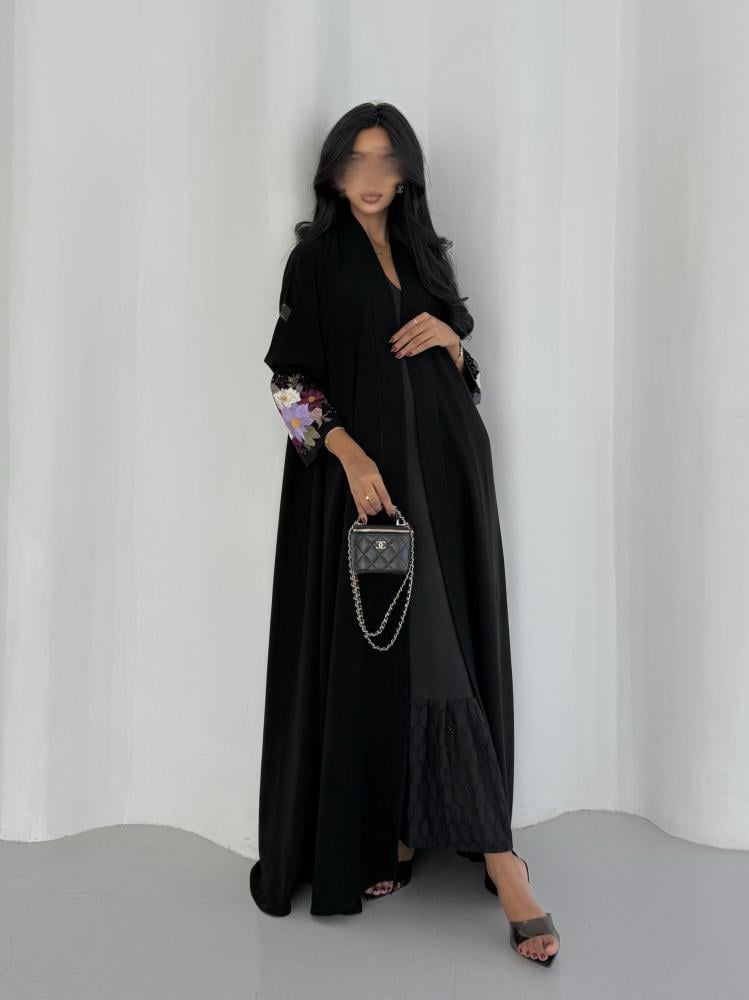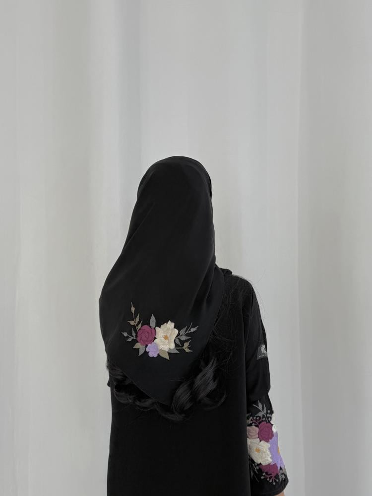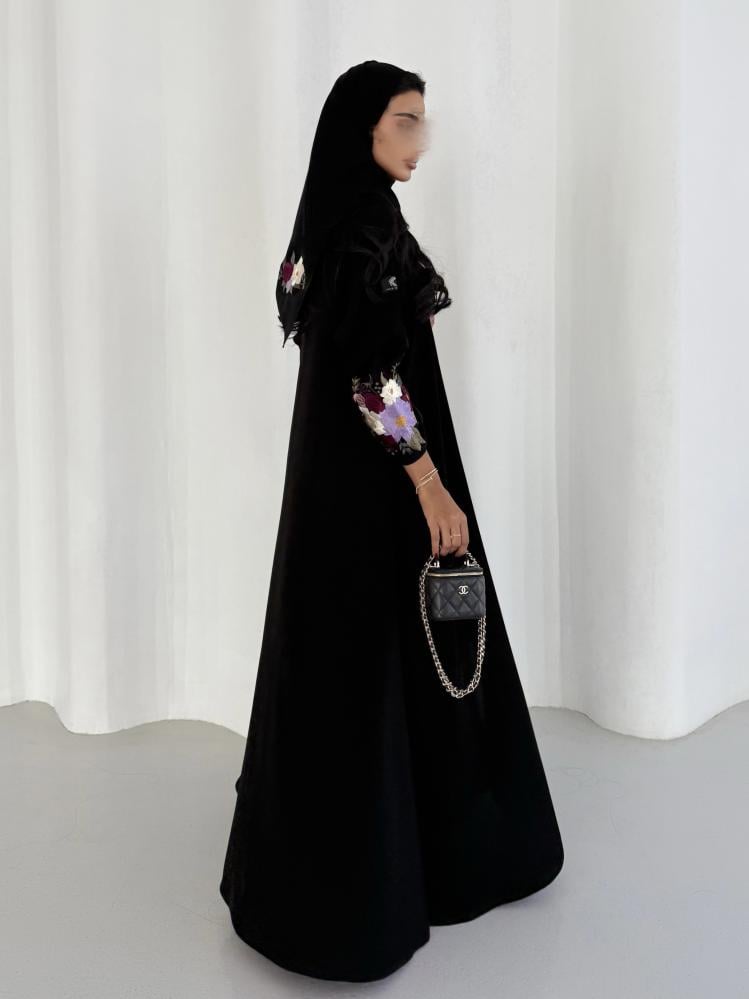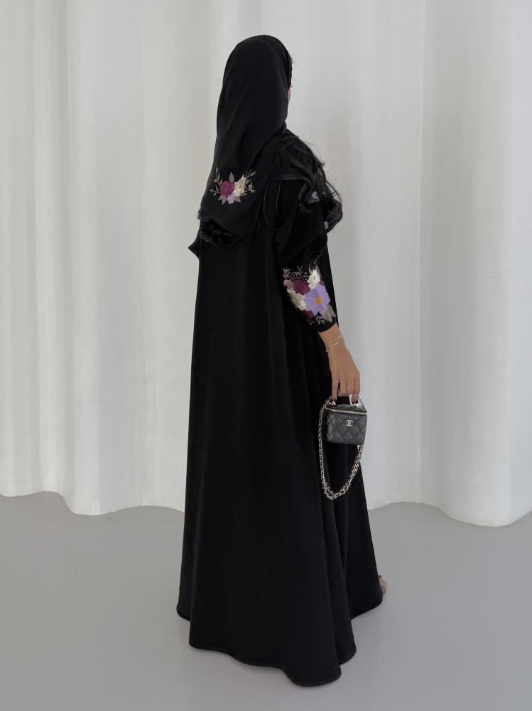 العباية: كريب ملكي كوري أسود مع تطريز يدوي على الاكمام وطرف الطرحة من الخلف