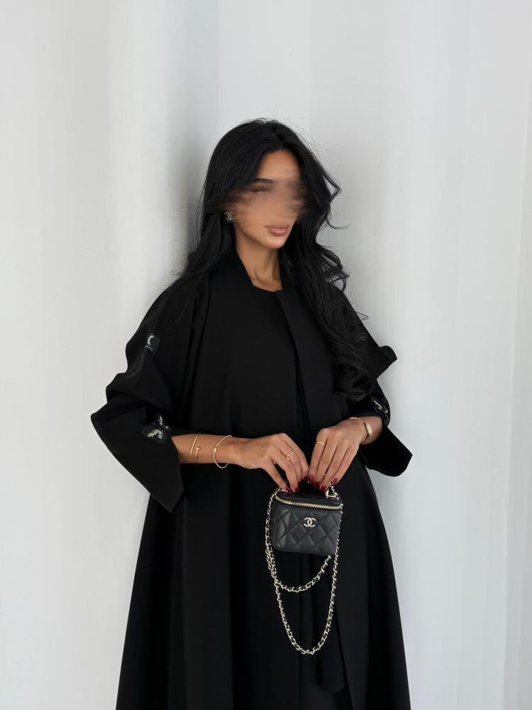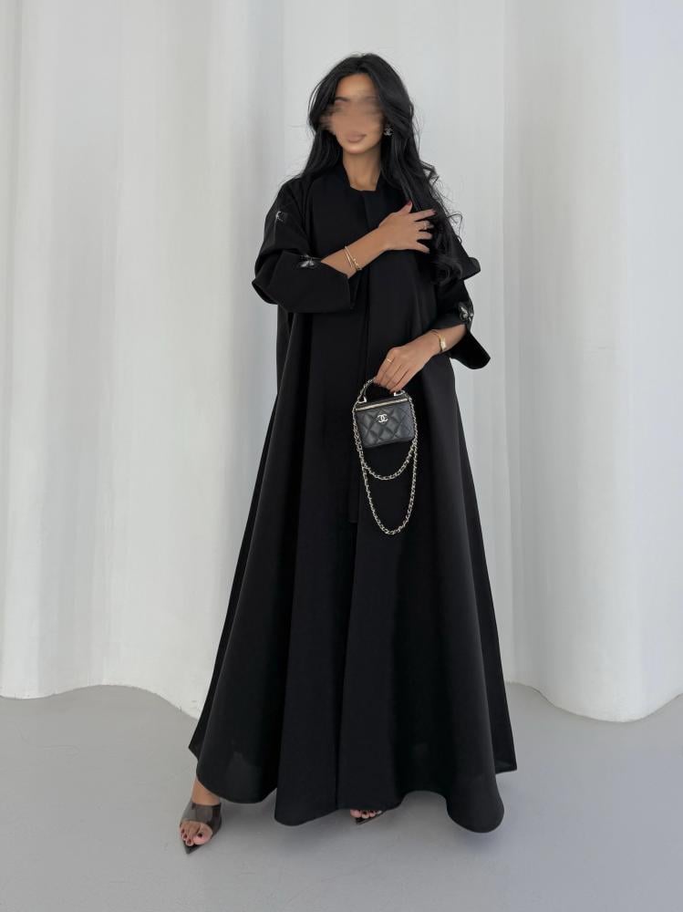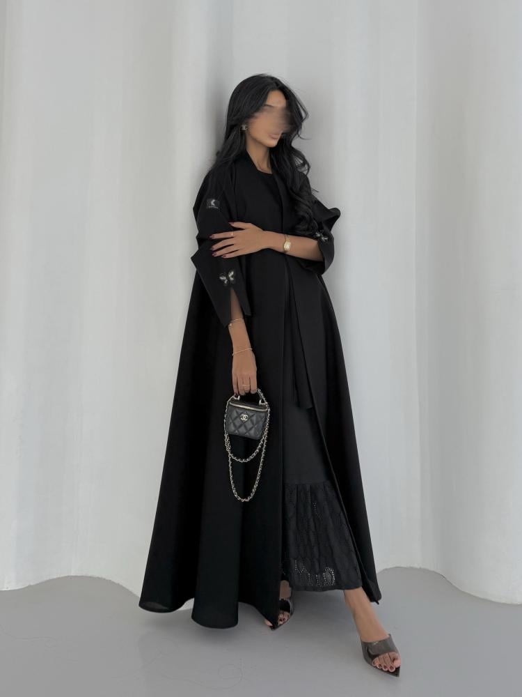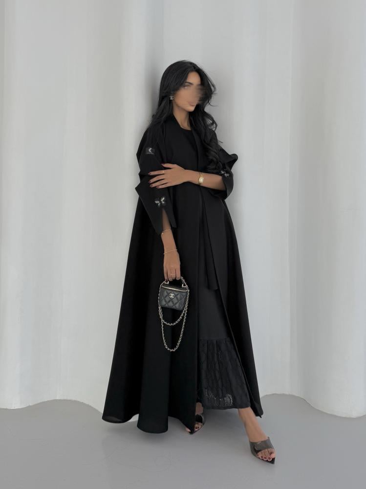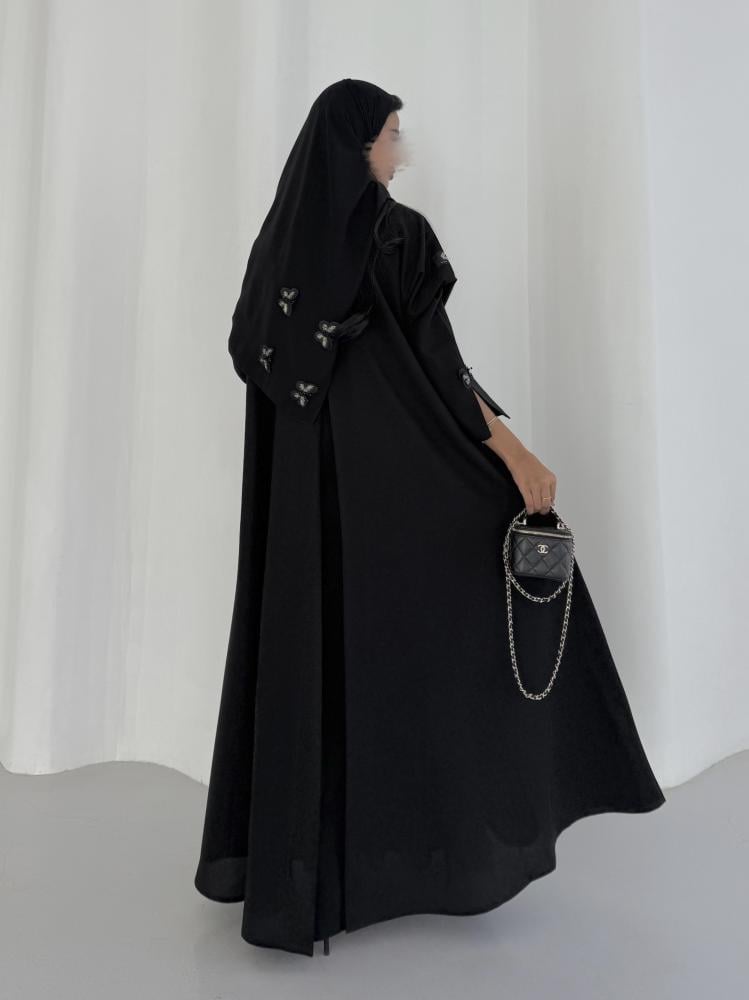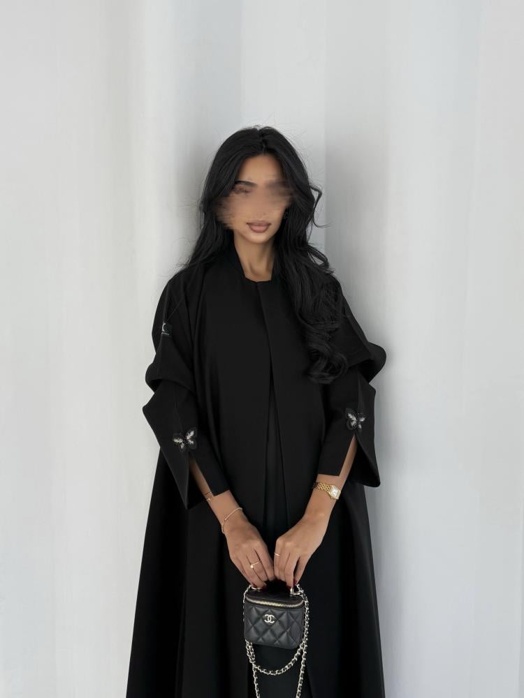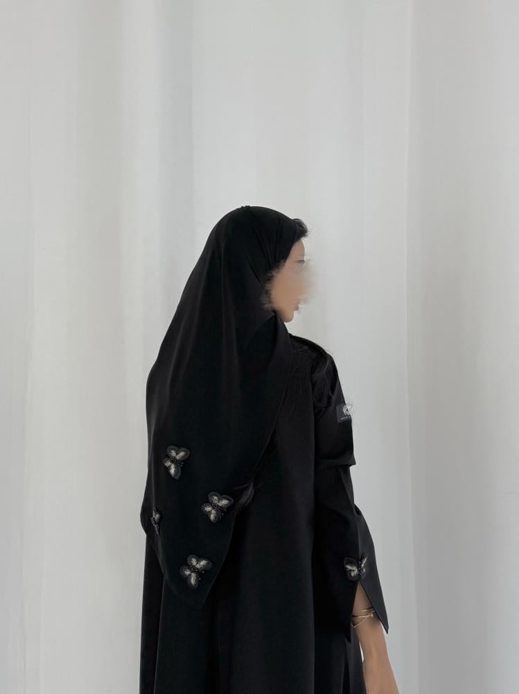 القماش: كتان أسود بكسرة خلفية ناعمة مع كلفة فراشات على الاكمام وطرف الطرحة