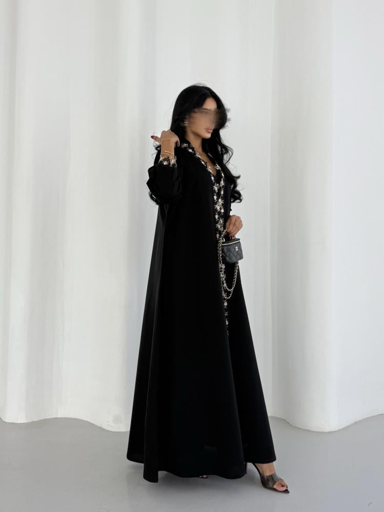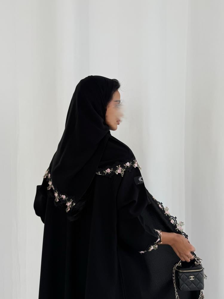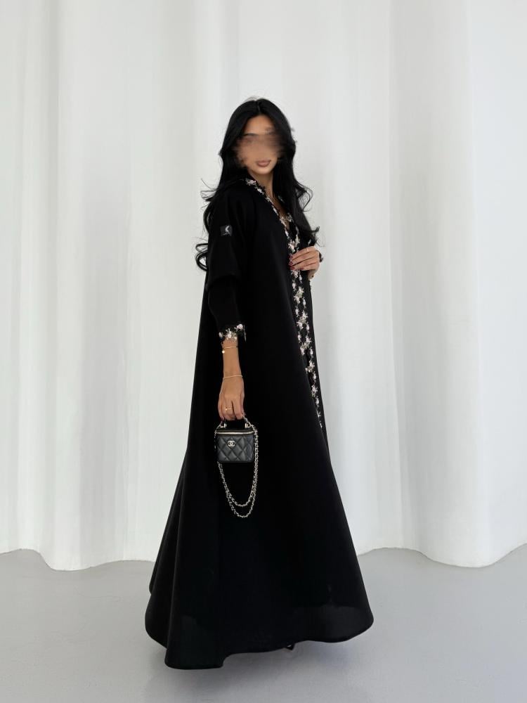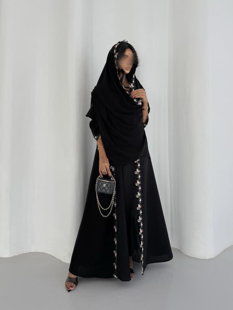 القماش: كتان أسود بكسرة خلفية ناعمة مع كلفة فراشات على الاكمام وطرف الطرحة