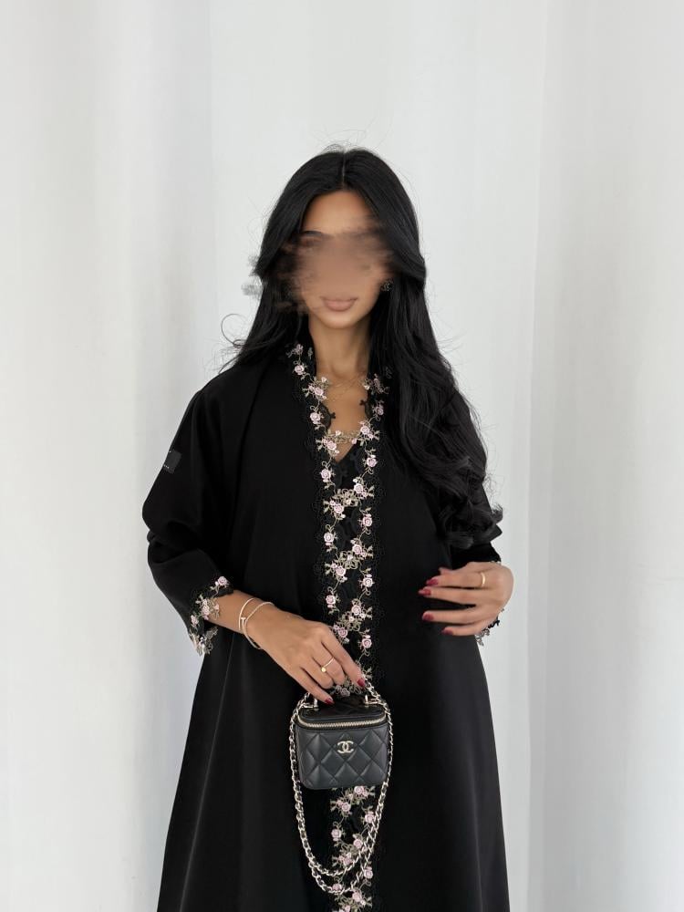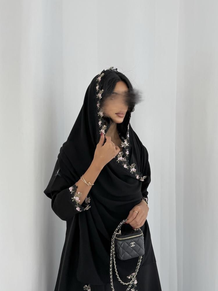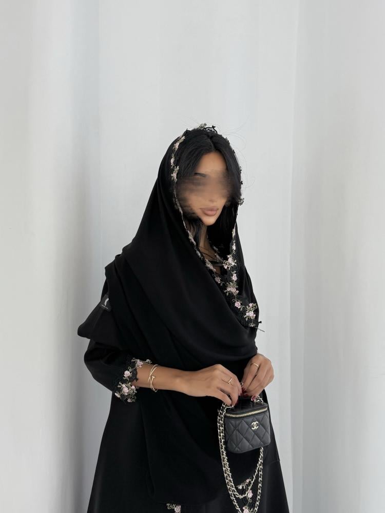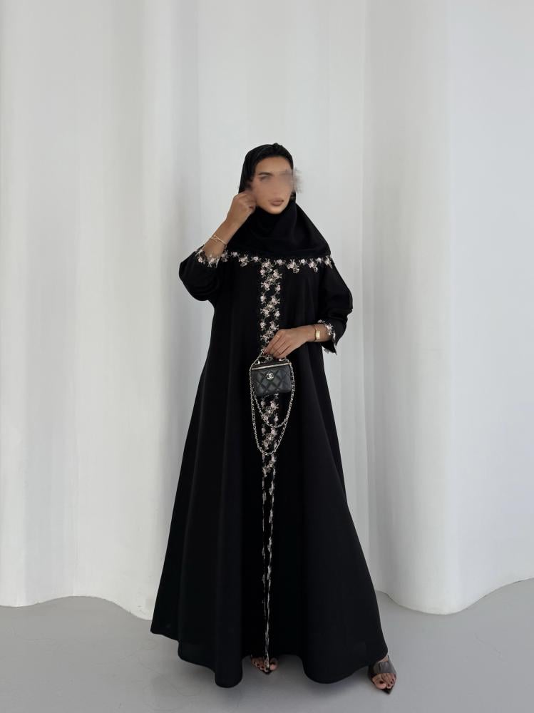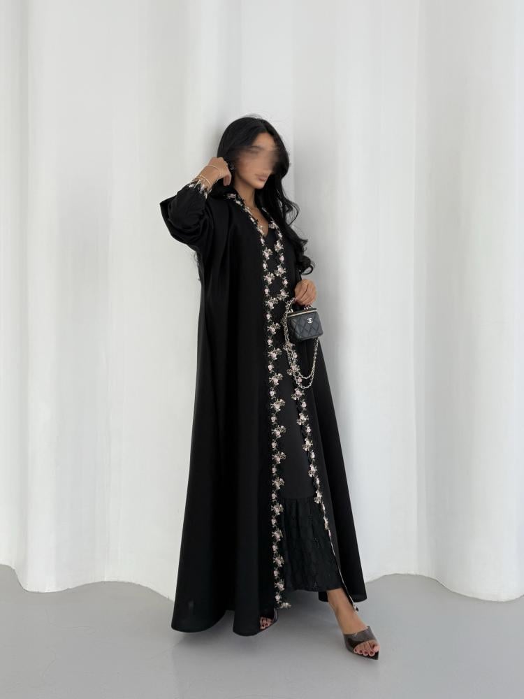 القماش: كتان أسود بكسرة خلفية ناعمة مع كلفة فراشات على الاكمام وطرف الطرحة