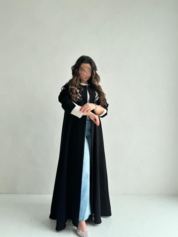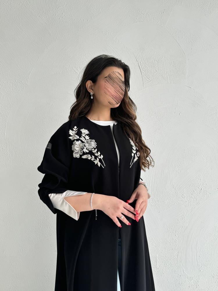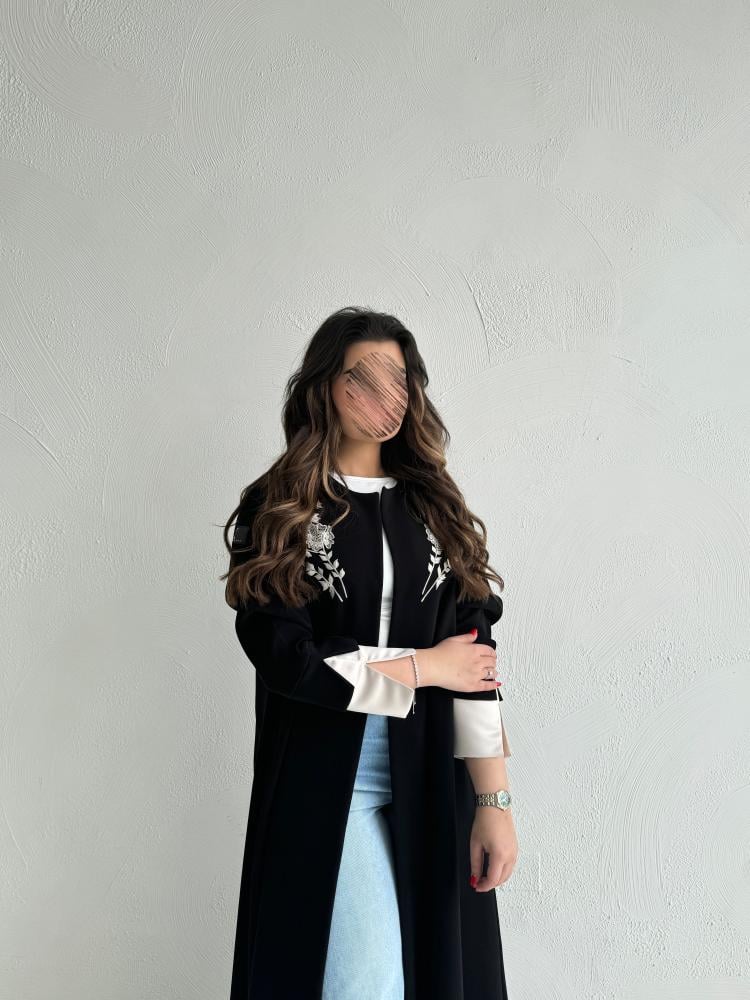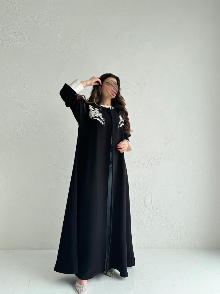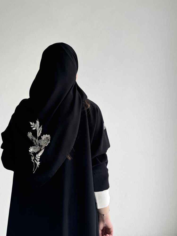 عباية كريب اسود مع تطريز يدوي على الصدر والطرحة