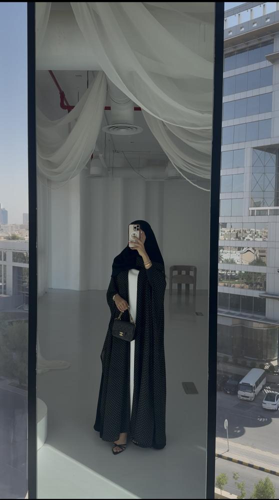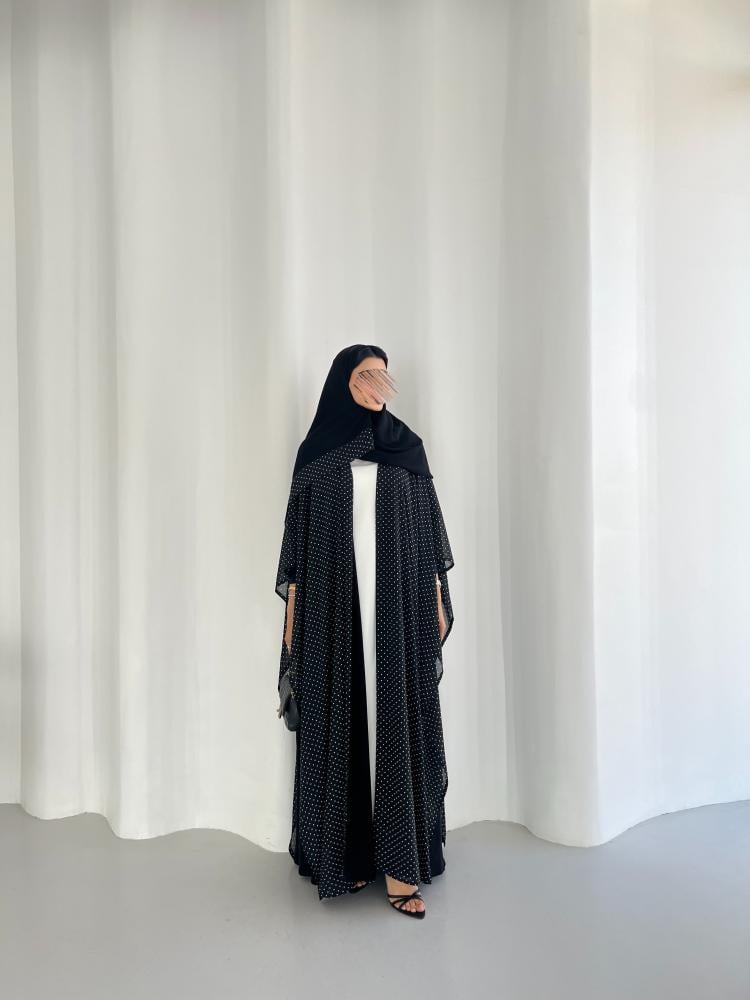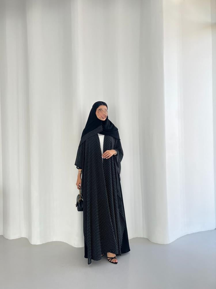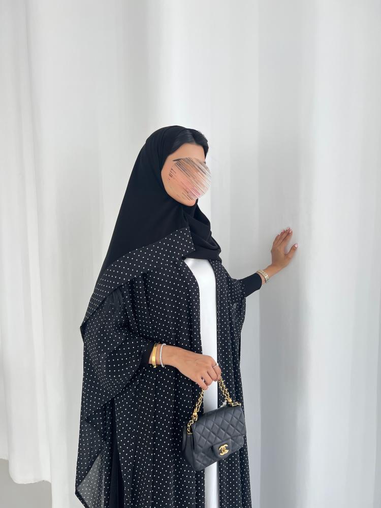 لقماش: كريب أسود خفيف مع شيفون منقط polka dots و طرحة بطرف تحديد من الجنب