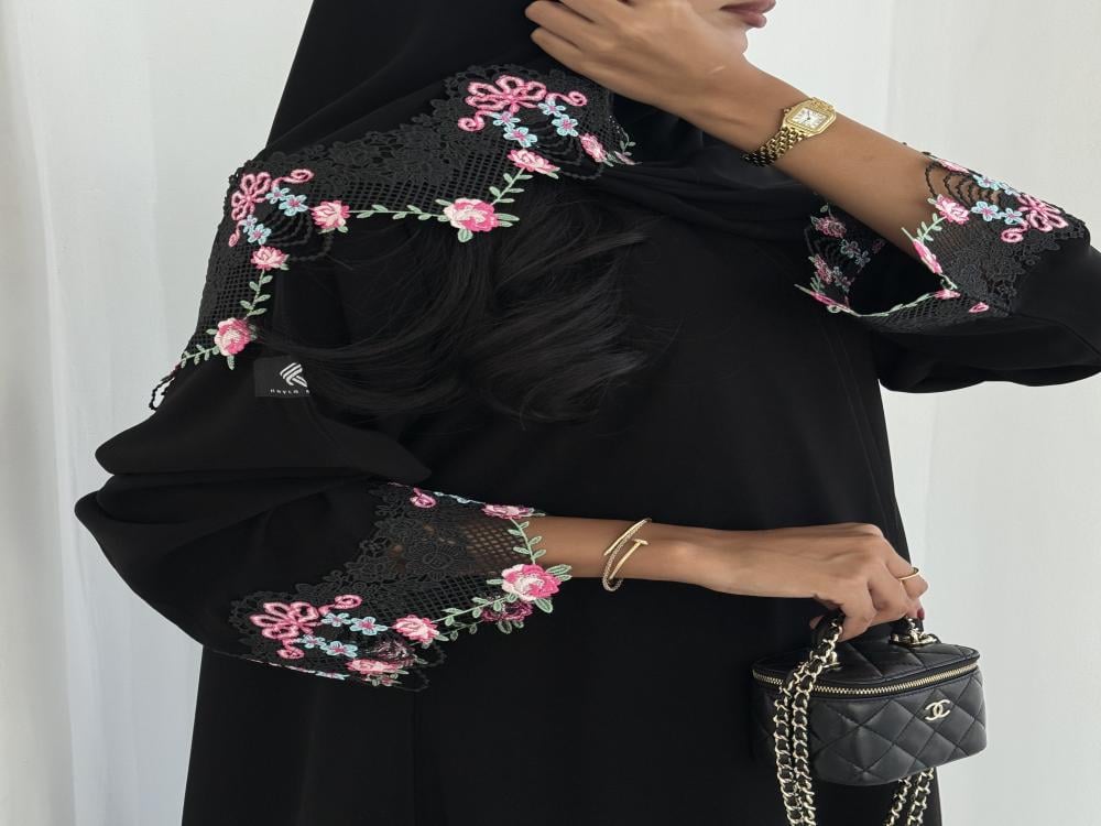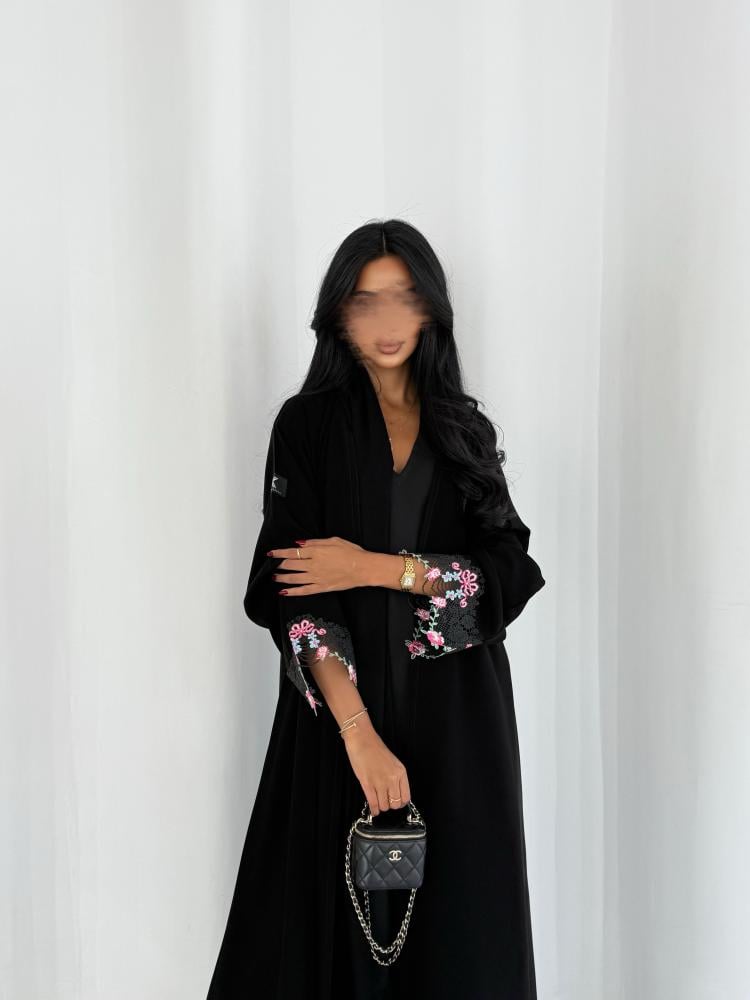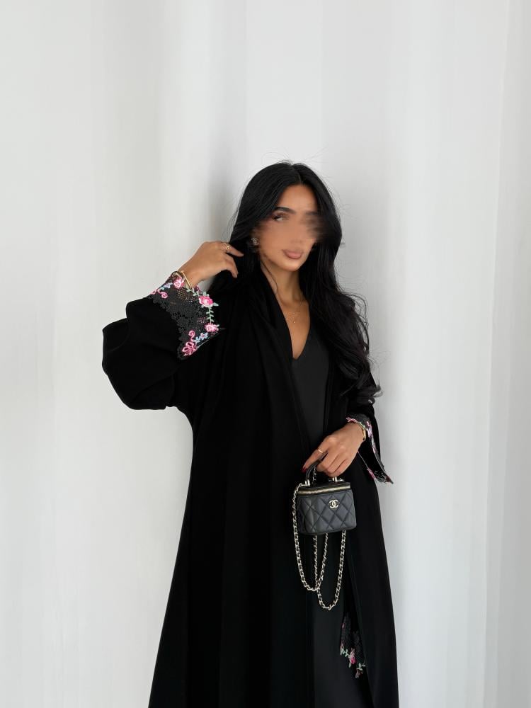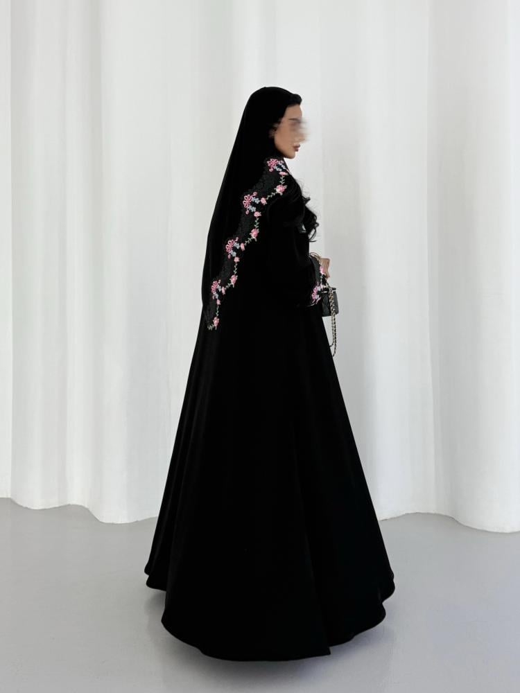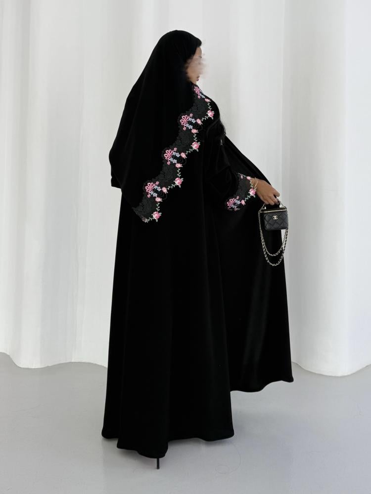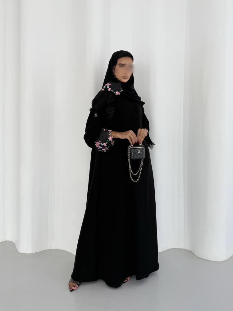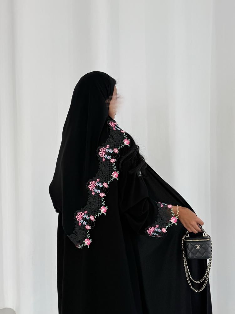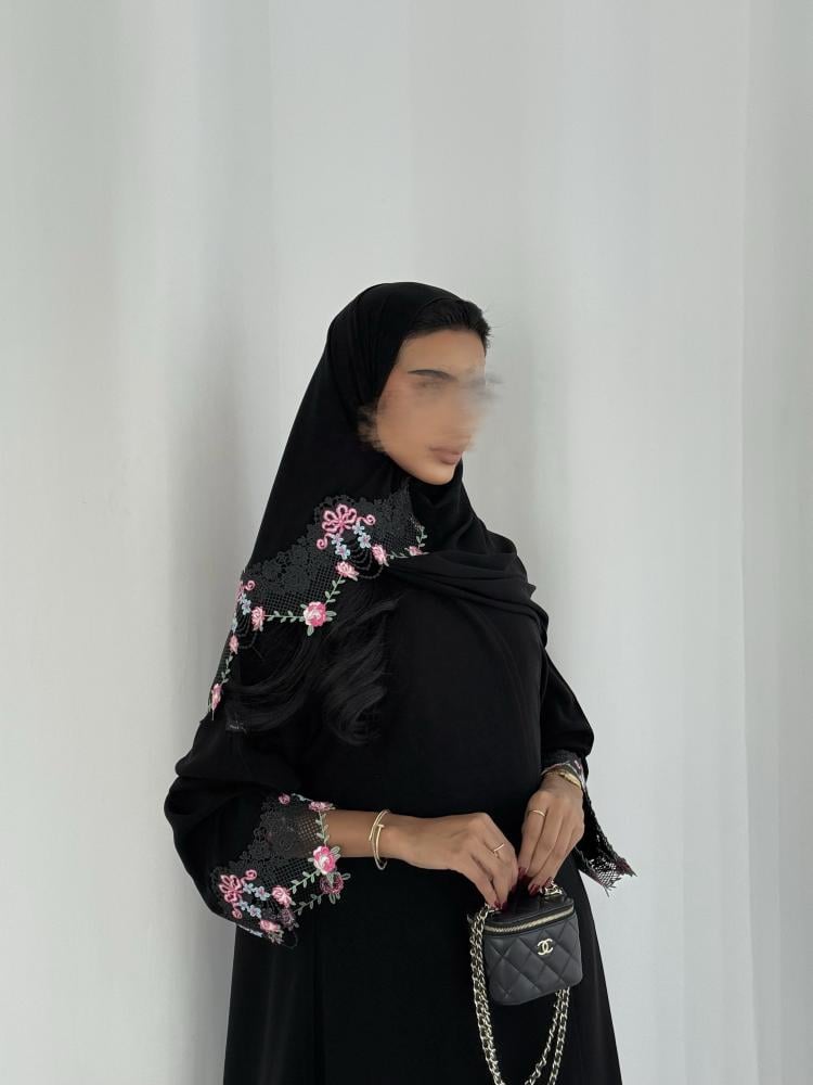 القماش: كريب أسود ملكي مع كلفة تطريز على العباية و الطرحة