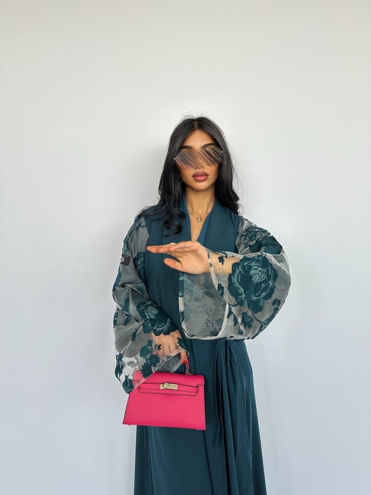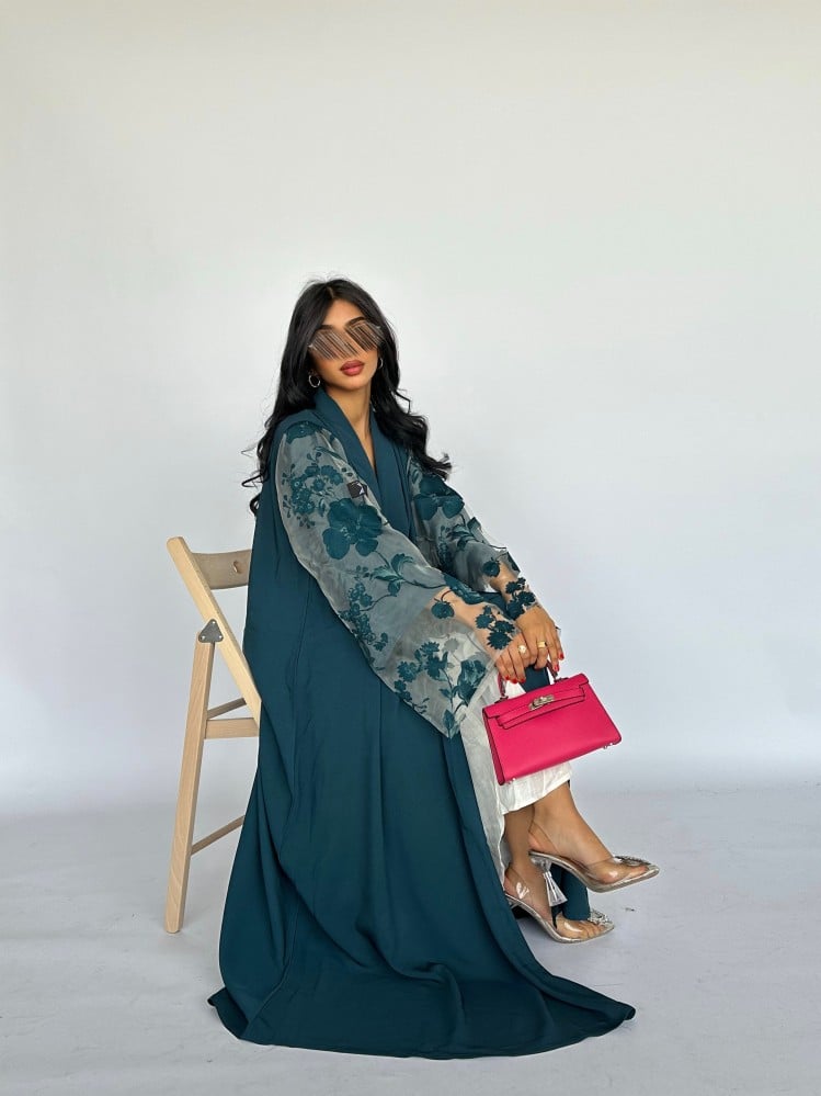 تُرفق طرحة مع العباية بلون فيروزي.