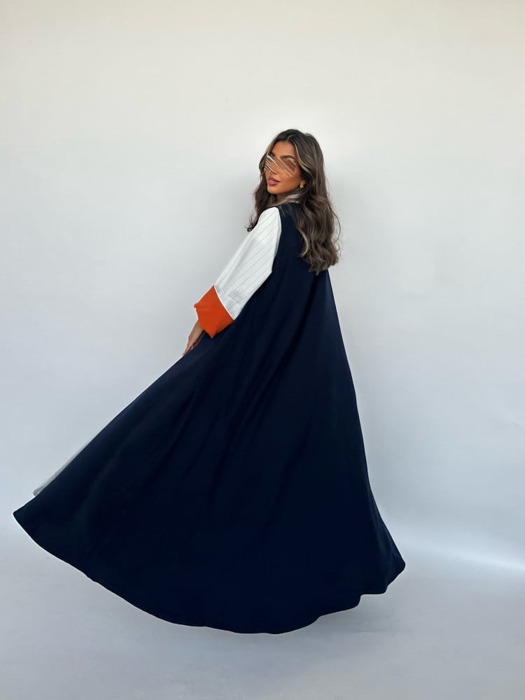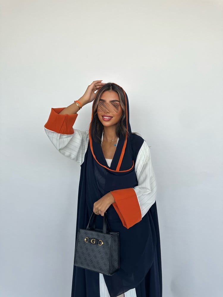 نوع القماش:كريب كحلي، مخطط ابيض، اورنج.قصة العباية: نص كلوش حرف A.تُرفق طرحة مع العباية بلون كحلي مع طرف اورنج.