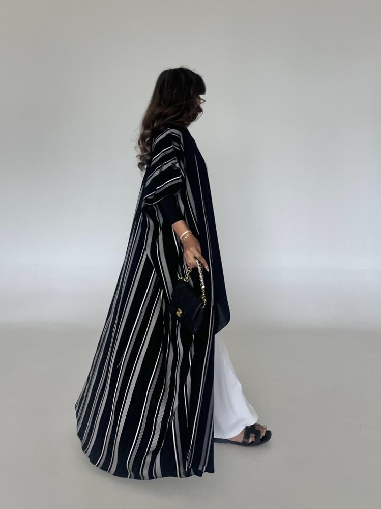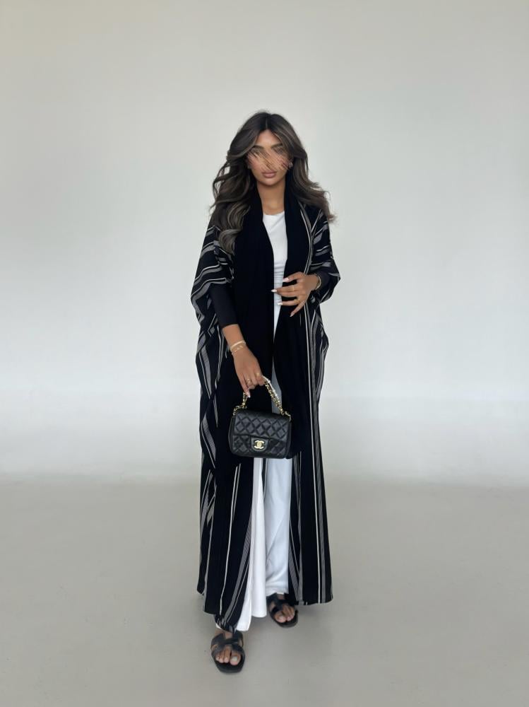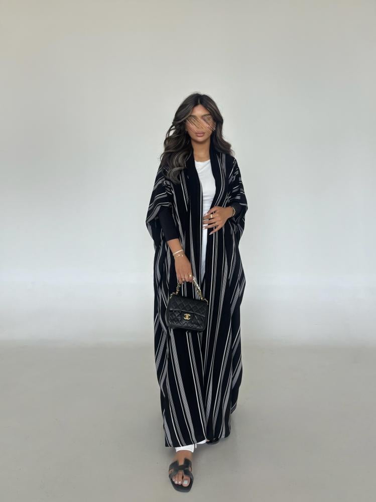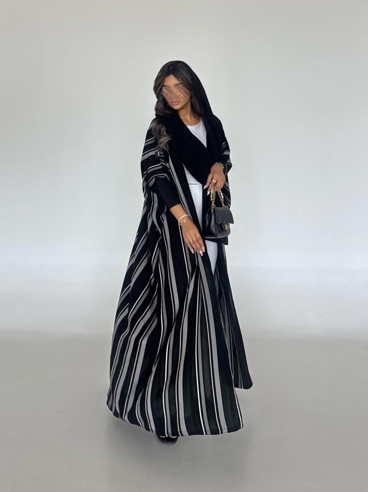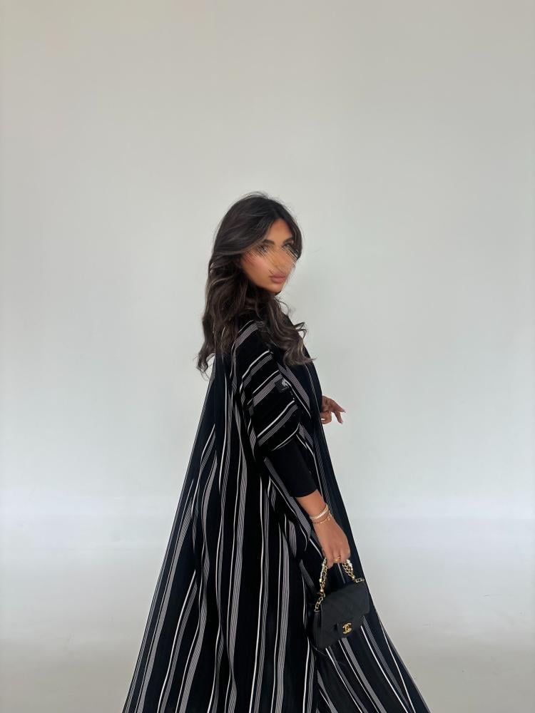 عباية كريب مخطط مع اكمام استرتش اسود
