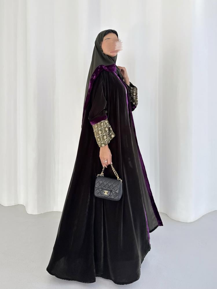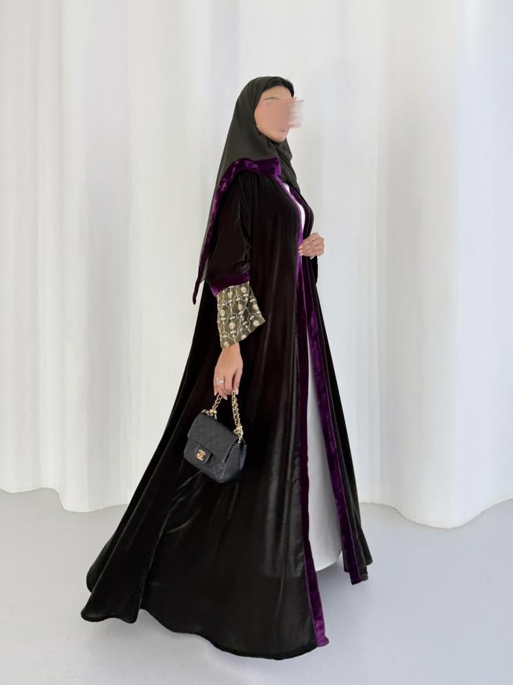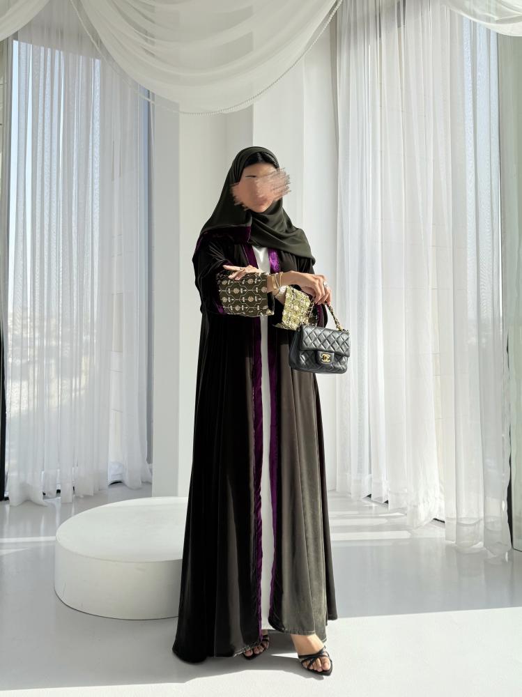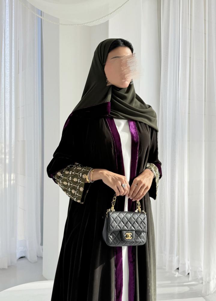 عباية مخمل زيتي مع تدخيلات مخمل موف ولنن مطرز